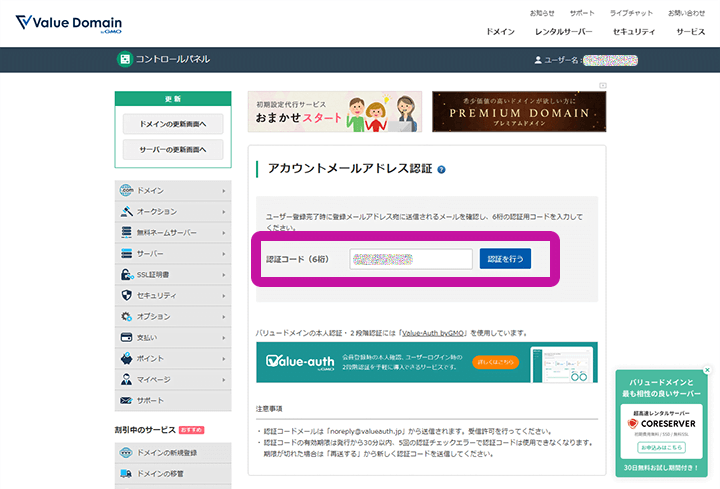 SMSもしくは音声通話で届いた認証コードを入力し、「認証して申し込みを完了する」ボタンをクリックします。
